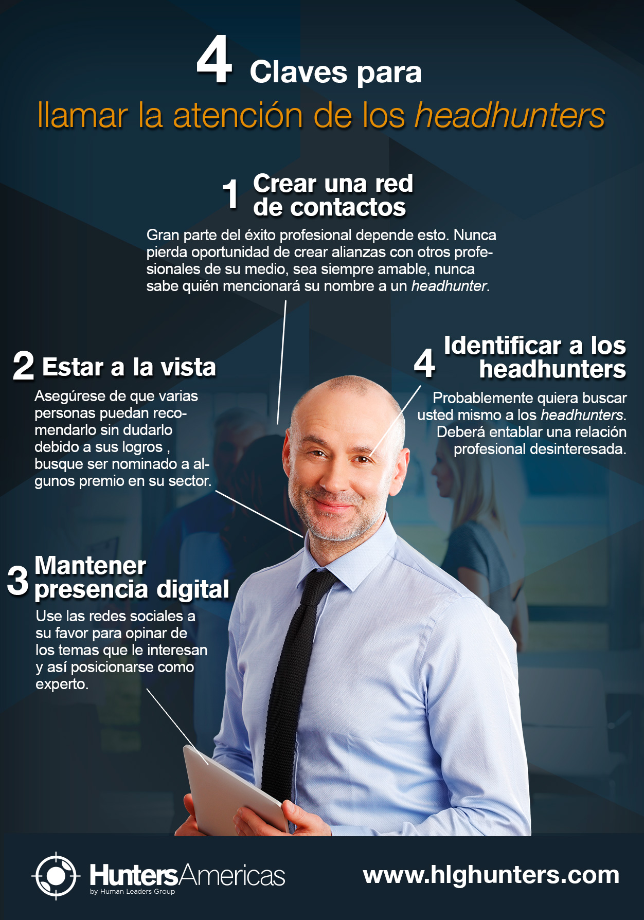 Todos los días, en todo el mundo, se toman decisiones de negocios importantes que benefician o afectan la vida de los consumidores. Para dirigirlas, los fundadores de las empresas han tenido que encontrar a los ejecutivos mejor preparados, algunas veces cruzando fronteras. El sistema que lo ha hecho posible es el Headhunting, ya que los headhunters son la fuerza que mueve el mercado laboral a través del mundo; son quienes conocen de primera mano los cambios en la economía, están preparados para afrontar los retos que esto conlleva y saben por experiencia el tipo de profesionales que necesita cada empresa.